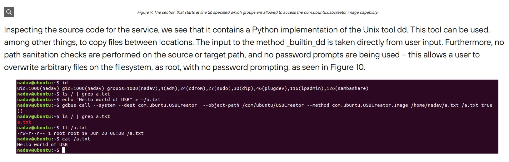 I found a blog that showed a flaw in the USBCreator D-Bus interface: