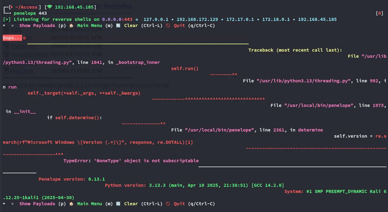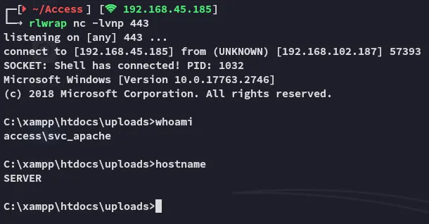 PORT STATE SERVICE REASON VERSION53/tcp open domain syn-ack Simple DNS Plus80/tcp open http syn-ack Apache httpd 2.4.48 ((Win64) OpenSSL/1.1.1k PHP/8.0.7)|_http-favicon: Unknown favicon MD5: FED84E16B6CCFE88EE7FFAAE5DFEFD34|_http-title: Access The Event|_http-server-header: Apache/2.4.48 (Win64) OpenSSL/1.1.1k PHP/8.0.7| http-methods:| Supported Methods: POST OPTIONS HEAD GET TRACE|_ Potentially risky methods: TRACE88/tcp open kerberos-sec syn-ack Microsoft Windows Kerberos (server time: 2025-05-19 08:13:45Z)135/tcp open msrpc syn-ack Microsoft Windows RPC139/tcp open netbios-ssn syn-ack Microsoft Windows netbios-ssn389/tcp open ldap syn-ack Microsoft Windows Active Directory LDAP (Domain: access.offsec0., Site: Default-First-Site-Name)443/tcp open ssl/http syn-ack Apache httpd 2.4.48 (OpenSSL/1.1.1k PHP/8.0.7)445/tcp open microsoft-ds? syn-ack464/tcp open kpasswd5? syn-ack593/tcp open ncacn_http syn-ack Microsoft Windows RPC over HTTP 1.0636/tcp open tcpwrapped syn-ack3268/tcp open ldap syn-ack Microsoft Windows Active Directory LDAP (Domain: access.offsec0., Site: Default-First-Site-Name)3269/tcp open tcpwrapped syn-ack5985/tcp open http syn-ack Microsoft HTTPAPI httpd 2.0 (SSDP/UPnP)|_http-server-header: Microsoft-HTTPAPI/2.0|_http-title: Not Found9389/tcp open mc-nmf syn-ack .NET Message Framing47001/tcp open http syn-ack Microsoft HTTPAPI httpd 2.0 (SSDP/UPnP)|_http-title: Not Found|_http-server-header: Microsoft-HTTPAPI/2.049664/tcp open msrpc syn-ack Microsoft Windows RPC49665/tcp open msrpc syn-ack Microsoft Windows RPC49666/tcp open msrpc syn-ack Microsoft Windows RPC49668/tcp open msrpc syn-ack Microsoft Windows RPC49669/tcp open msrpc syn-ack Microsoft Windows RPC49670/tcp open ncacn_http syn-ack Microsoft Windows RPC over HTTP 1.049671/tcp open msrpc syn-ack Microsoft Windows RPC49674/tcp open msrpc syn-ack Microsoft Windows RPC49679/tcp open msrpc syn-ack Microsoft Windows RPC49701/tcp open msrpc syn-ack Microsoft Windows RPCService Info: Hosts: SERVER, www.example.com; OS: Windows; CPE: cpe:/o:microsoft:windows80/TCP - HTTP