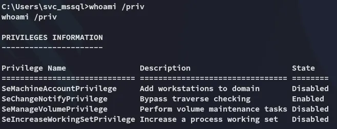 Since we’re a svc account I crossed my fingers hoping we have the SeImpersonatePrivilege enabled.