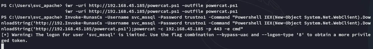 Thus we have verified that we can execute commands as svc_mssql. We can now go ahead and create a reverse shell by uploading powercat.ps1 in order to get a reverse shell as svc_mssql.