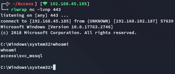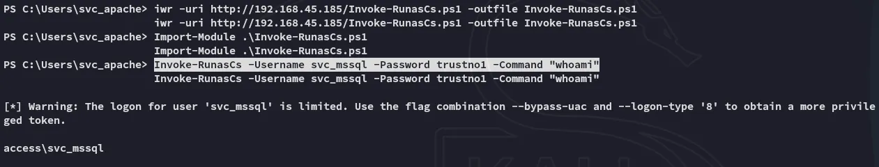 To circumvent this issue and get access as svc_mssql via our existing reverse shell we can use the following script: