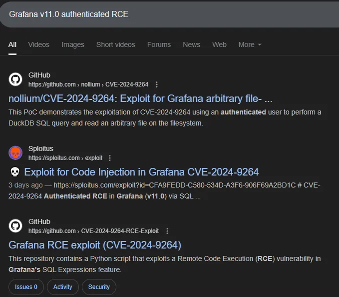 I then searched up whether there was any RCE exploit for the Grafana v11.0 version: