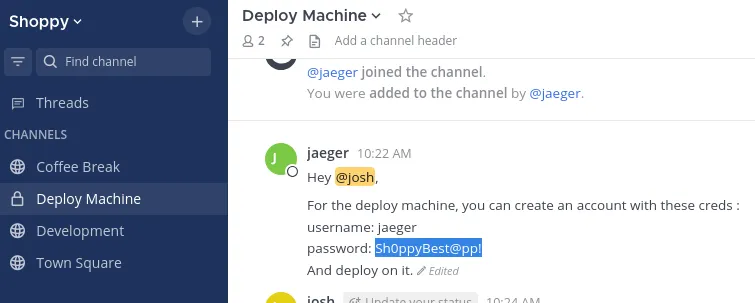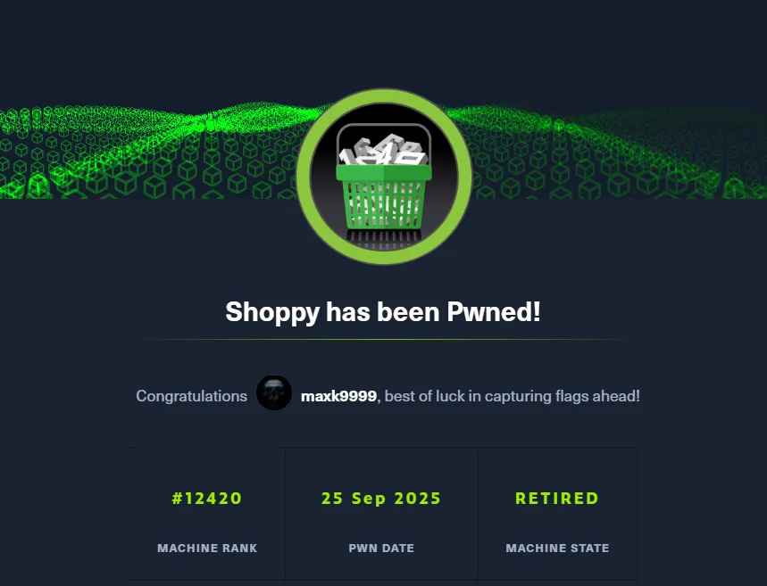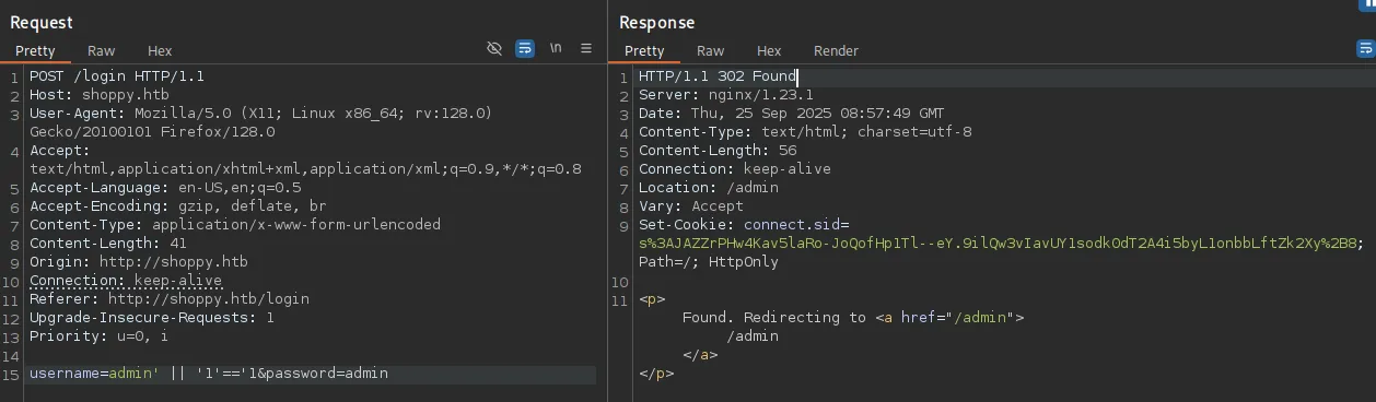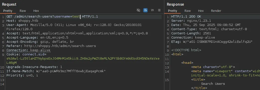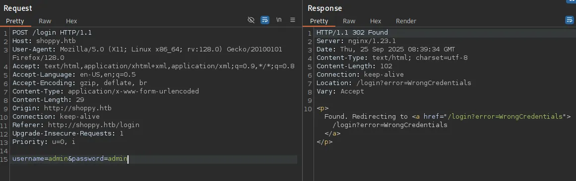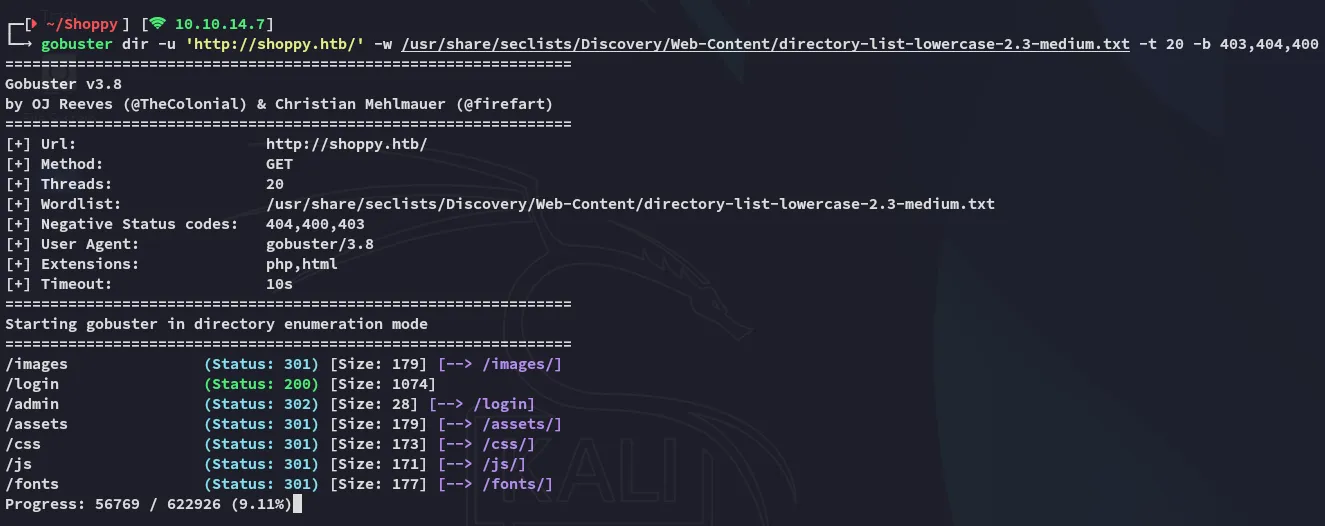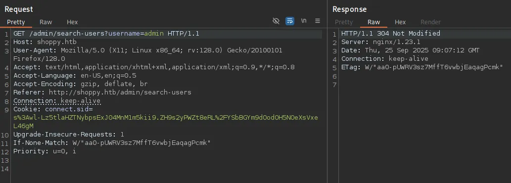 PORT STATE SERVICE REASON VERSION22/tcp open ssh syn-ack OpenSSH 8.4p1 Debian 5+deb11u1 (protocol 2.0)80/tcp open http syn-ack nginx 1.23.1|_http-title: Shoppy Wait Page|_http-server-header: nginx/1.23.1|_http-favicon: Unknown favicon MD5: D5F0A0ADD0BFBB2BC51607F78ECE2F57| http-methods:|_ Supported Methods: GET HEAD POST OPTIONS9093/tcp open http syn-ack Golang net/http server|_http-trane-info: Problem with XML parsing of /evox/about| http-methods:|_ Supported Methods: GET HEAD POST OPTIONS|_http-favicon: Unknown favicon MD5: DEAA4EF1DE78FC2D7744B12A667FA28C|_http-title: Site doesnt have a title (text/plain; version=0.0.4; charset=utf-8).| fingerprint-strings:| GenericLines:| HTTP/1.1 400 Bad Request| Content-Type: text/plain; charset=utf-8| Connection: close| Request| GetRequest:| HTTP/1.0 200 OK| Content-Type: text/plain; version=0.0.4; charset=utf-8| Date: Thu, 25 Sep 2025 08:35:12 GMT80/TCP - HTTP