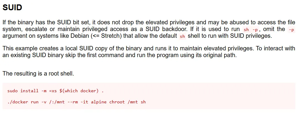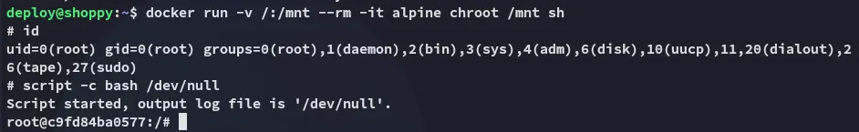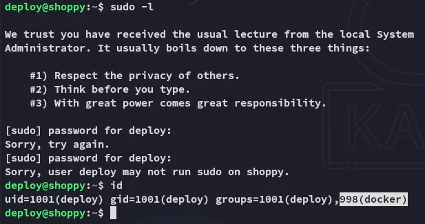 Eventhough we weren’t able to run sudo -l we still find that we’re part of the docker group.