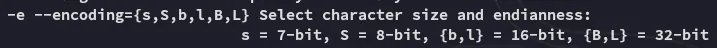 Furthermore we can use the -e option on strings in order to select character endianness: