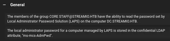 After ingesting the data we notice that JDGodd is part of the CORE STAFF group. This group has the ReadLAPSPassword permission enabled: