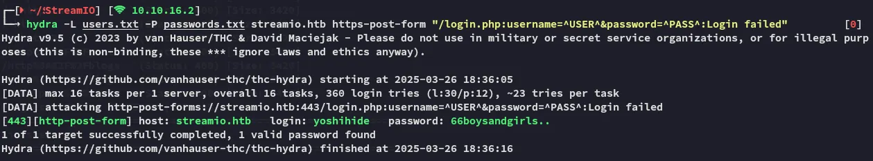 I tried to password spray the creds against either winrm or smb but neither worked unfortunately, so I decided to try out the web server instead using hydra: