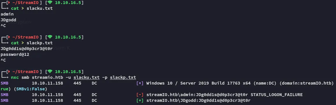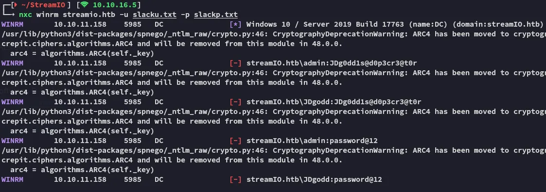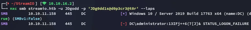 # Set up credentials$pass = ConvertTo-SecureString 'JDg0dd1s@d0p3cr3@t0r' -AsPlainText -Force$cred = New-Object System.Management.Automation.PSCredential('streamio.htb\JDgodd', $pass)