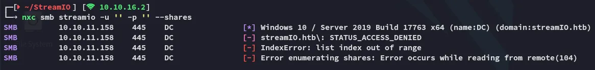 PORT STATE SERVICE REASON VERSION53/tcp open domain syn-ack Simple DNS Plus80/tcp open http syn-ack Microsoft IIS httpd 10.0| http-methods:| Supported Methods: OPTIONS TRACE GET HEAD POST|_ Potentially risky methods: TRACE|_http-server-header: Microsoft-IIS/10.0|_http-title: IIS Windows Server88/tcp open kerberos-sec syn-ack Microsoft Windows Kerberos (server time: 2025-03-26 20:47:51Z)135/tcp open msrpc syn-ack Microsoft Windows RPC139/tcp open netbios-ssn syn-ack Microsoft Windows netbios-ssn389/tcp open ldap syn-ack Microsoft Windows Active Directory LDAP (Domain: streamIO.htb0., Site: Default-First-Site-Name)443/tcp open ssl/http syn-ack Microsoft HTTPAPI httpd 2.0 (SSDP/UPnP)|_http-server-header: Microsoft-HTTPAPI/2.0| tls-alpn:|_ http/1.1|_ssl-date: 2025-03-26T20:49:22+00:00; +7h00m00s from scanner time.| ssl-cert: Subject: commonName=streamIO/countryName=EU| Subject Alternative Name: DNS:streamIO.htb, DNS:watch.streamIO.htb| Issuer: commonName=streamIO/countryName=EU445/tcp open microsoft-ds? syn-ack464/tcp open kpasswd5? syn-ack593/tcp open ncacn_http syn-ack Microsoft Windows RPC over HTTP 1.0636/tcp open tcpwrapped syn-ack3268/tcp open ldap syn-ack Microsoft Windows Active Directory LDAP (Domain: streamIO.htb0., Site: Default-First-Site-Name)3269/tcp open tcpwrapped syn-ack5985/tcp open http syn-ack Microsoft HTTPAPI httpd 2.0 (SSDP/UPnP)|_http-title: Not Found|_http-server-header: Microsoft-HTTPAPI/2.09389/tcp open mc-nmf syn-ack .NET Message Framing49667/tcp open msrpc syn-ack Microsoft Windows RPC49673/tcp open msrpc syn-ack Microsoft Windows RPC49674/tcp open ncacn_http syn-ack Microsoft Windows RPC over HTTP 1.049705/tcp open msrpc syn-ack Microsoft Windows RPCI also checked for UDP ports, specifically 161 but got the following result: