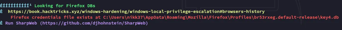 I then uploaded winPEASx64.exe and let it run, where I found the following notable stuff: