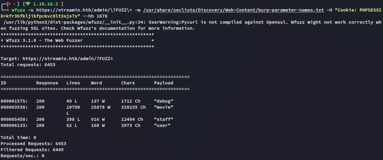 wfuzz -u https://streamio.htb/admin/\?FUZZ\= -w /usr/share/seclists/Discovery/Web-Content/burp-parameter-names.txt -H "Cookie: PHPSESSID=kfr3bfkljibfpckvc8lt3sjs7s" --hh 1678