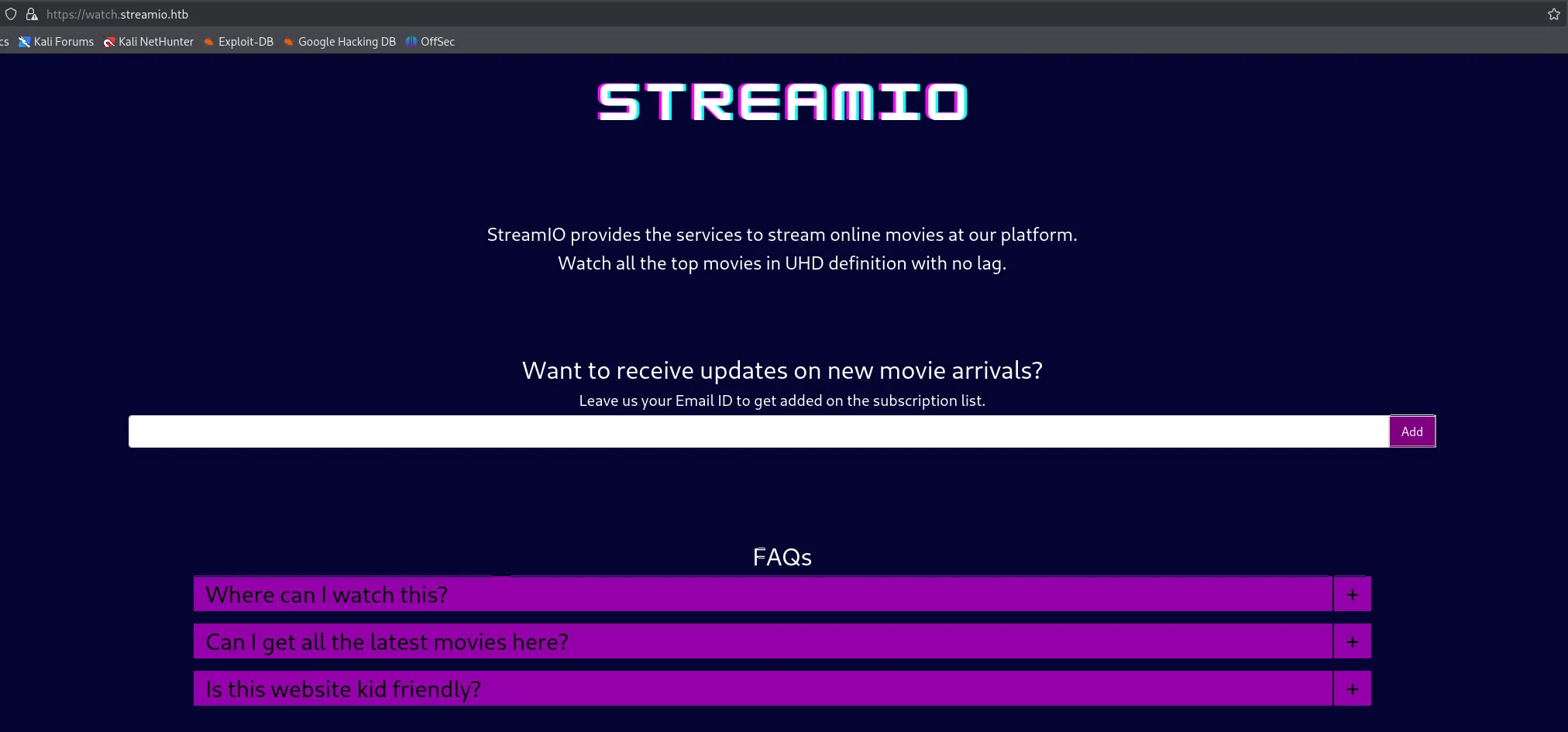 I notice the watch.streamIO.htb subdomain, which I add to my /etc/hosts list. I then go ahead and look up the website: