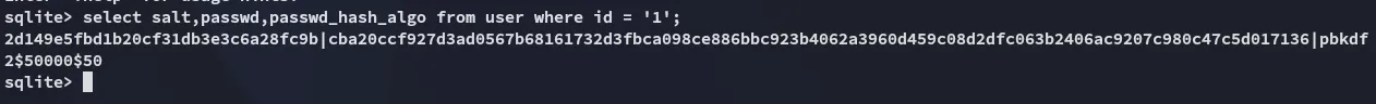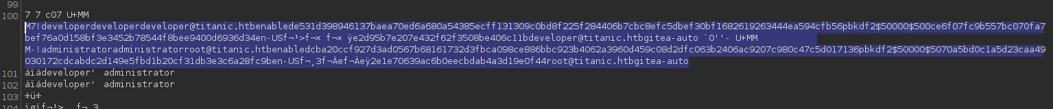 sqlite> SELECT * FROM user;1|administrator|administrator||root@titanic.htb|0|enabled|cba20ccf927d3ad0567b68161732d3fbca098ce886bbc923b4062a3960d459c08d2dfc063b2406ac9207c980c47c5d017136|pbkdf2$50000$50|0|0|0||0|||70a5bd0c1a5d23caa49030172cdcabdc|2d149e5fbd1b20cf31db3e3c6a28fc9b|en-US||1722595379|1722597477|1722597477|0|-1|1|1|0|0|0|1|0|2e1e70639ac6b0eecbdab4a3d19e0f44|root@titanic.htb|0|0|0|0|0|0|0|0|0||gitea-auto|0