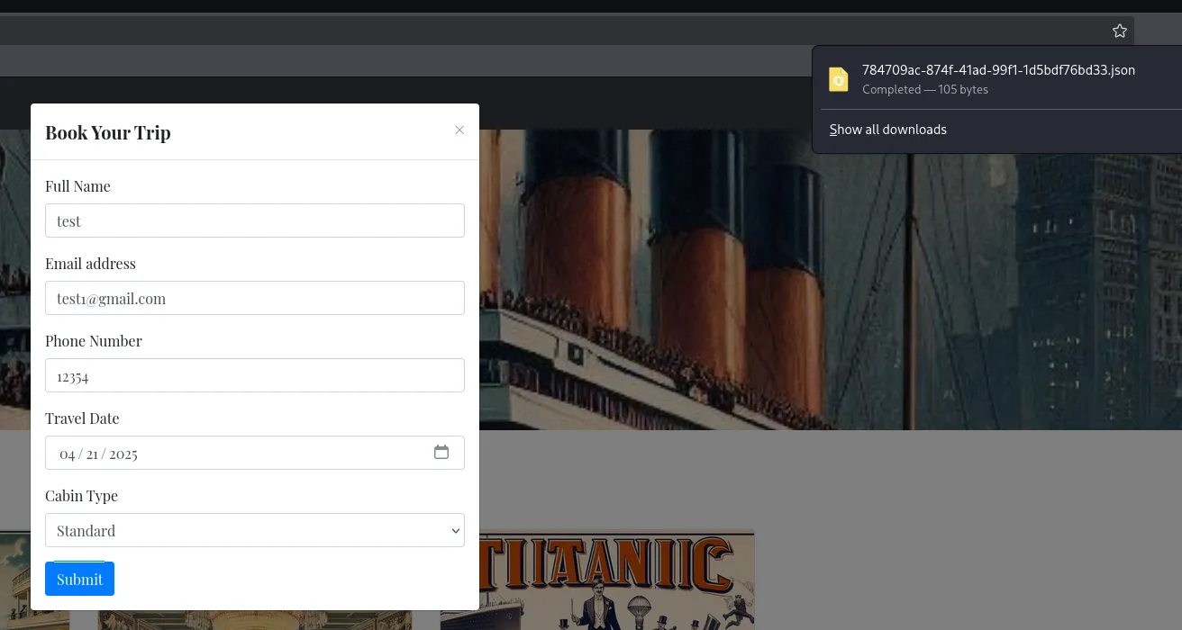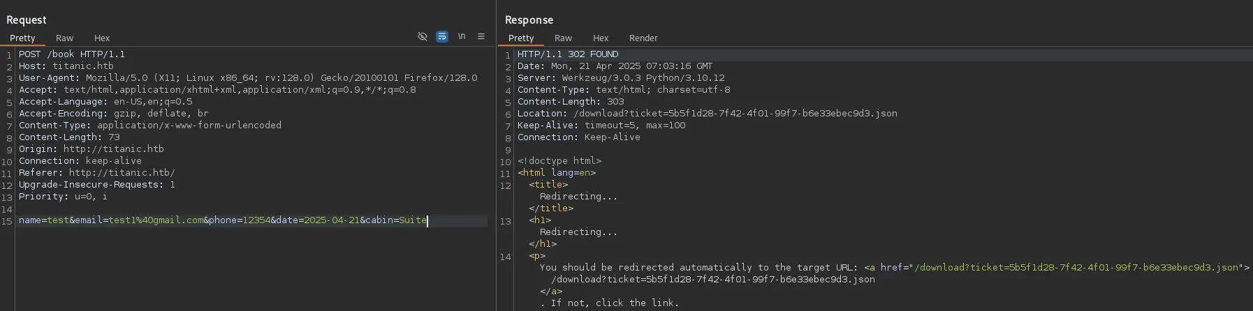PORT STATE SERVICE REASON VERSION22/tcp open ssh syn-ack OpenSSH 8.9p1 Ubuntu 3ubuntu0.10 (Ubuntu Linux; protocol 2.0)80/tcp open http syn-ack Apache httpd 2.4.52|_http-title: Did not follow redirect to http://titanic.htb/| http-methods:|_ Supported Methods: GET HEAD POST OPTIONS|_http-server-header: Apache/2.4.52 (Ubuntu)Service Info: Host: titanic.htb; OS: Linux; CPE: cpe:/o:linux:linux_kernelWe only have 2 ports, let’s check out port 80 first.