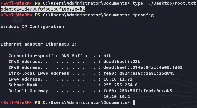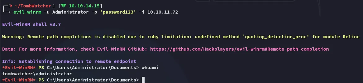 Now we can go ahead and use the newly set creds to log into evil-winrm as Administrator: