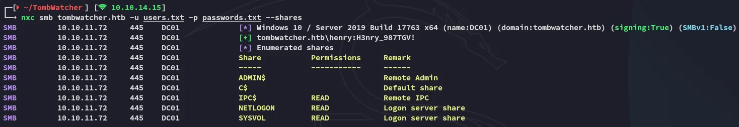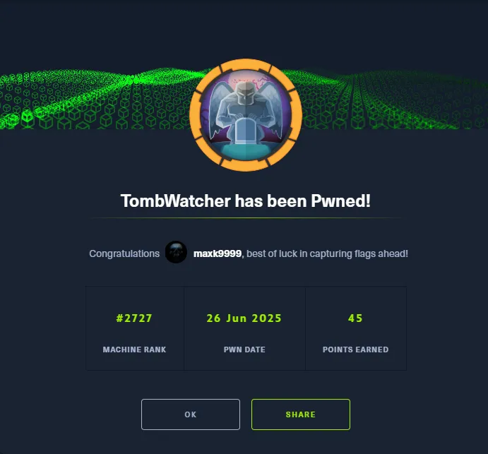 PORT STATE SERVICE REASON VERSION53/tcp open domain syn-ack Simple DNS Plus80/tcp open http syn-ack Microsoft IIS httpd 10.0|_http-title: IIS Windows Server| http-methods:| Supported Methods: OPTIONS TRACE GET HEAD POST|_ Potentially risky methods: TRACE|_http-server-header: Microsoft-IIS/10.088/tcp open kerberos-sec syn-ack Microsoft Windows Kerberos (server time: 2025-06-12 17:52:41Z)135/tcp open msrpc syn-ack Microsoft Windows RPC139/tcp open netbios-ssn syn-ack Microsoft Windows netbios-ssn389/tcp open ldap syn-ack Microsoft Windows Active Directory LDAP (Domain: tombwatcher.htb0., Site: Default-First-Site-Name)| ssl-cert: Subject: commonName=DC01.tombwatcher.htb| Subject Alternative Name: othername: 1.3.6.1.4.1.311.25.1:<unsupported>, DNS:DC01.tombwatcher.htb| Issuer: commonName=tombwatcher-CA-1/domainComponent=tombwatcher445/tcp open microsoft-ds? syn-ack464/tcp open kpasswd5? syn-ack593/tcp open ncacn_http syn-ack Microsoft Windows RPC over HTTP 1.0636/tcp open ssl/ldap syn-ack Microsoft Windows Active Directory LDAP (Domain: tombwatcher.htb0., Site: Default-First-Site-Name)| ssl-cert: Subject: commonName=DC01.tombwatcher.htb| Subject Alternative Name: othername: 1.3.6.1.4.1.311.25.1:<unsupported>, DNS:DC01.tombwatcher.htb| Issuer: commonName=tombwatcher-CA-1/domainComponent=tombwatcher3268/tcp open ldap syn-ack Microsoft Windows Active Directory LDAP (Domain: tombwatcher.htb0., Site: Default-First-Site-Name)| ssl-cert: Subject: commonName=DC01.tombwatcher.htb| Subject Alternative Name: othername: 1.3.6.1.4.1.311.25.1:<unsupported>, DNS:DC01.tombwatcher.htb| Issuer: commonName=tombwatcher-CA-1/domainComponent=tombwatcher3269/tcp open ssl/ldap syn-ack Microsoft Windows Active Directory LDAP (Domain: tombwatcher.htb0., Site: Default-First-Site-Name)|_ssl-date: 2025-06-12T17:54:10+00:00; +4h00m00s from scanner time.| ssl-cert: Subject: commonName=DC01.tombwatcher.htb| Subject Alternative Name: othername: 1.3.6.1.4.1.311.25.1:<unsupported>, DNS:DC01.tombwatcher.htb| Issuer: commonName=tombwatcher-CA-1/domainComponent=tombwatcher5985/tcp open http syn-ack Microsoft HTTPAPI httpd 2.0 (SSDP/UPnP)|_http-title: Not Found|_http-server-header: Microsoft-HTTPAPI/2.09389/tcp open mc-nmf syn-ack .NET Message Framing49666/tcp open msrpc syn-ack Microsoft Windows RPC49691/tcp open ncacn_http syn-ack Microsoft Windows RPC over HTTP 1.049692/tcp open msrpc syn-ack Microsoft Windows RPC49694/tcp open msrpc syn-ack Microsoft Windows RPC49712/tcp open msrpc syn-ack Microsoft Windows RPC49727/tcp open msrpc syn-ack Microsoft Windows RPC49742/tcp open msrpc syn-ack Microsoft Windows RPCService Info: Host: DC01; OS: Windows; CPE: cpe:/o:microsoft:windows