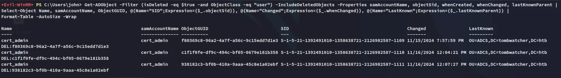 I will now use the following command to enumerate previously deleted user accounts, specifically looking for any privileged users that were part of the ADCS (Active Directory Certificate Services) structure.