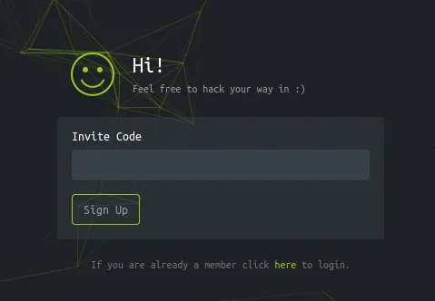 I noticed an /api endpoint but it gave a 401 code so I couldn’t access it (yet). Instead I checked out the /invite endpoint.