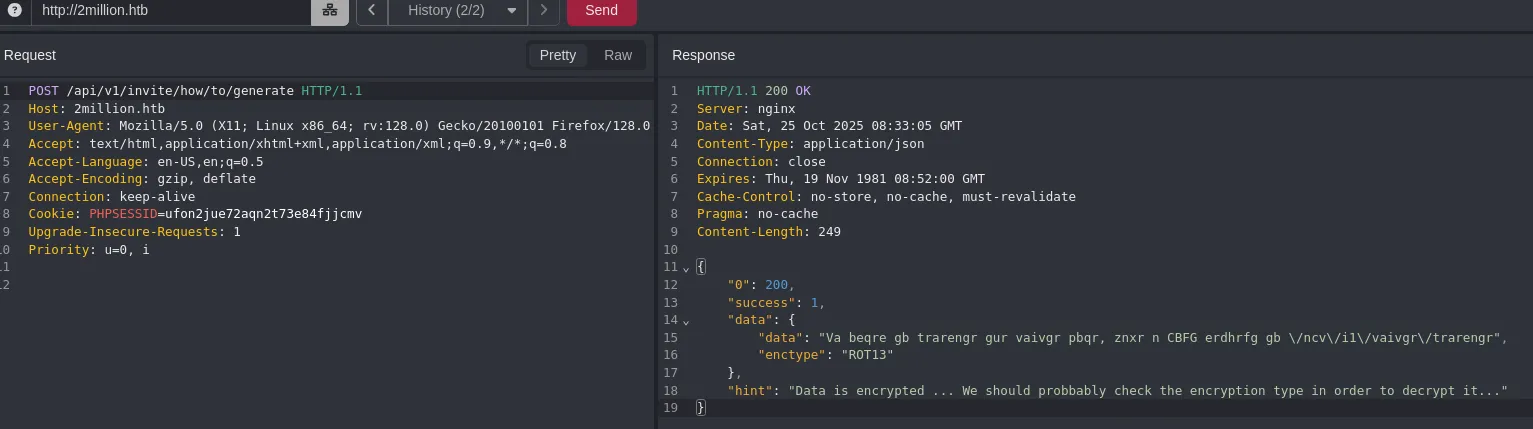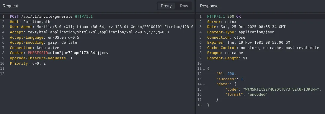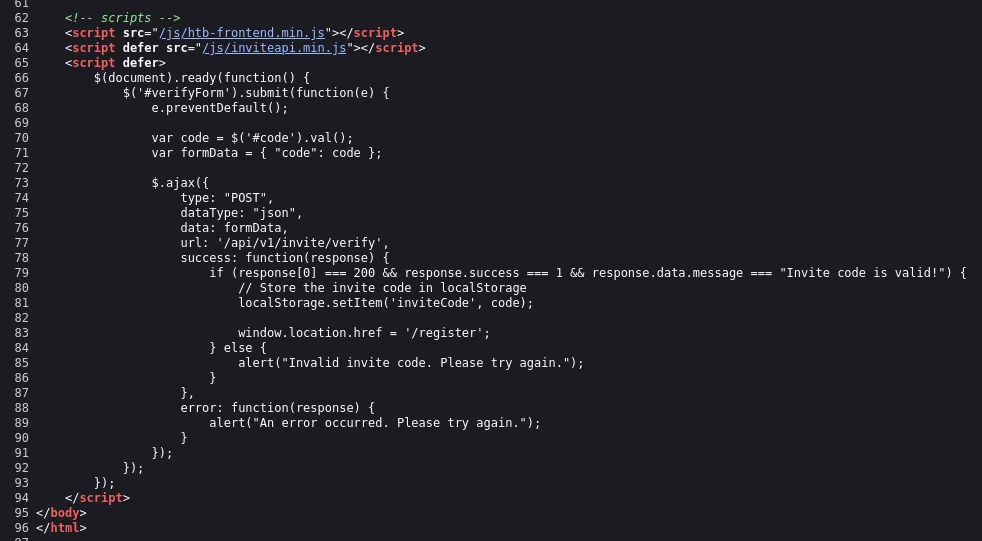 function verifyInviteCode(code) { var formData= { "code":code }; $.ajax( { type:"POST",dataType:"json",data:formData,url:'/api/v1/invite/verify',success:function(response) { console.log(response) } ,error:function(response) { console.log(response) } } )}function makeInviteCode() { $.ajax( { type:"POST",dataType:"json",url:'/api/v1/invite/how/to/generate',success:function(response) { console.log(response) } ,error:function(response) { console.log(response) } } )}This looks interesting, we can analyse the api call through caido: