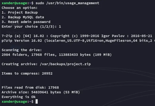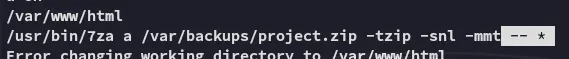 We notice that it zips the /var/www/html directory up using 7z. However we also notice the Wildcard * option at the end!