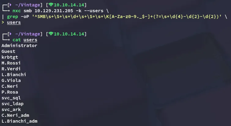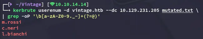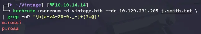 kerbrute userenum -d vintage.htb --dc 10.129.231.205 j.smith.txt \| grep -oP '\b[a-zA-Z0-9._-]+(?=@)'