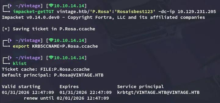 First I went ahead and requested a TGT for the P.Rosa user.
