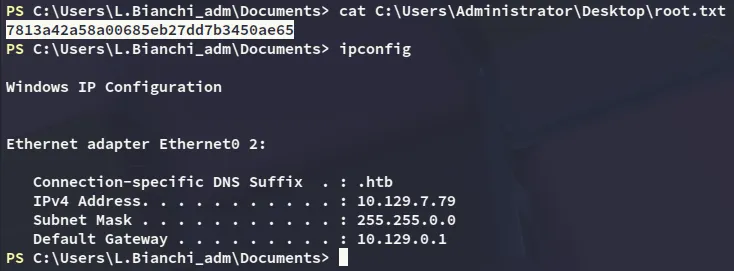 While it is not possible to use the Administrator account to log in, we can use L.Bianchi_adm to get an administrative shell.